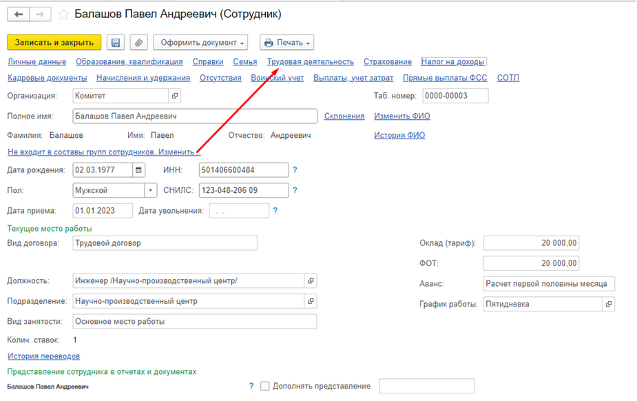 Для того что бы занести стажи нужно в карточке сотрудника перейти по ссылке «Трудовая деятельность». (рис.1)