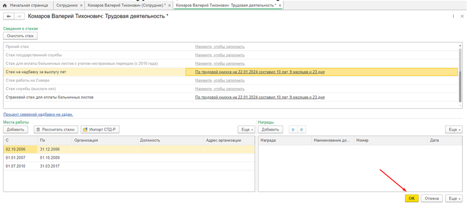 Если сотрудник работает по внутреннему совместительству, то стажи мы заносим только для основного. После того как занесли стажи не забудьте обязательно нажать «Ок» (рис.4) и записать сотрудника, иначе стажи не сохранятся. (рис.5)