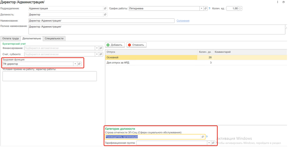 ВАЖНО УЧИТЫВАТЬ!!! При заполнении позиции штатного распускания указать ПКГ (профессиональная квалификационная группа), ПКУ (профессиональный квалификационный уровень), вид надбавки и квалификационную категорию (если таковые имеются) (рис.3) и на вкладке «Дополнительно» указание трудовой функции и категории должности (рис.4)