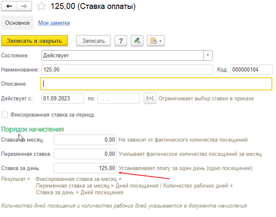 2) Ставка оплаты. В карточке Ставка оплаты цена занятия указывается в поле Ставка за день. В том случае, если в учреждении есть группы, в которых в день запланировано несколько часов занятий, в данном поле указывается стоимость занятия ЗА ЧАС.