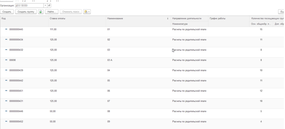Первое на что необходимо обратить внимание – это справочник Группы детского учреждения. В данном справочнике отображается список групп, относящихся к дошкольному учреждению. В верхнем углу списка необходимо указать Организацию.