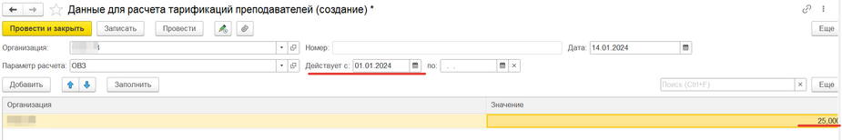 После чего создать новый документ «Данные для расчета тарификаций преподавателей» установить дату действия «с» 01.01.2024 и через кнопку добавить заполнить табличную часть с указанием значения 25%. (рис.7)