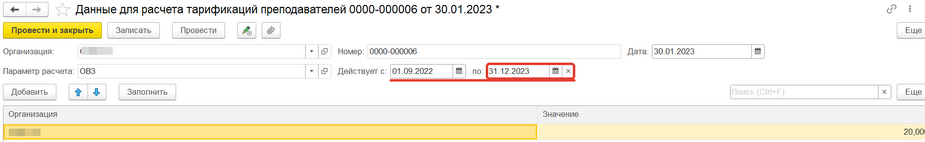 Если у вас изменилось значение какого-либо параметра, например: поменялось значение «ОВЗ» с 20% на 25% с 01.01.2024. Необходимо, как описывалось ранее, зайти в первоначальный документ с параметром расчета «ОВЗ» и установить дату действия «по» 31.12.2023. (рис.6)