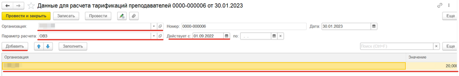 По кнопке «Создать» нужно создать документ и заполнить его, указав в шапке документа: вашу организацию, необходимый параметр расчета (в нашем примере это «ОВЗ»), и указать дату, с которой будет действовать данный параметр. По кнопке «Добавить» у вас в табличную часть добавится строка, которую нужно заполнить соответствующими данными, в случае «ОВЗ» надо будет заполнить ее, указав организацию и значение. (рис.3)