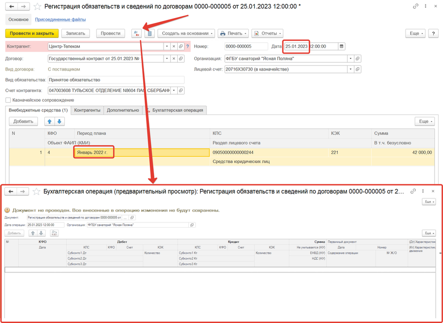 Если документ "Регистрация обязательств по договорам и иные обязательства" не формирует проводки, следует обратить внимание на период плана во вкладке "Внебюджетные средства". Дата документа и период плана должны быть равны или период плана должен быть позже даты документа