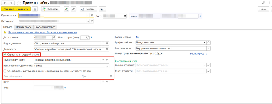 ВАЖНО!!! в документе приема на работу, установив данную галочку, так же указать трудовую функцию, чтобы к мероприятию подтянулся код ОКЗ, который также указывается в данном отчете