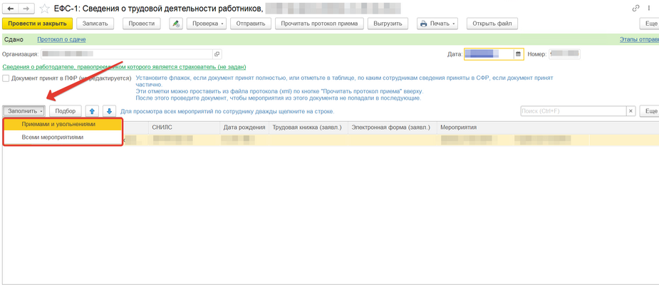 После данного действия, у Вас подтянутся все мероприятия, которые НЕ БЫЛИ ПЕРЕДАНЫ В СФР (бывш. ПФР), данный момент важно учитывать. Если Вы понимаете, что все нужные мероприятия попали в табличную часть, необходимо: установить галочку "Документ принят в ПФР (не редактируется) → нажать на кнопку "Провести" → "Отправить" → после чего можно закрывать документ и ждать ответа от СФР (бывш. ПФР).