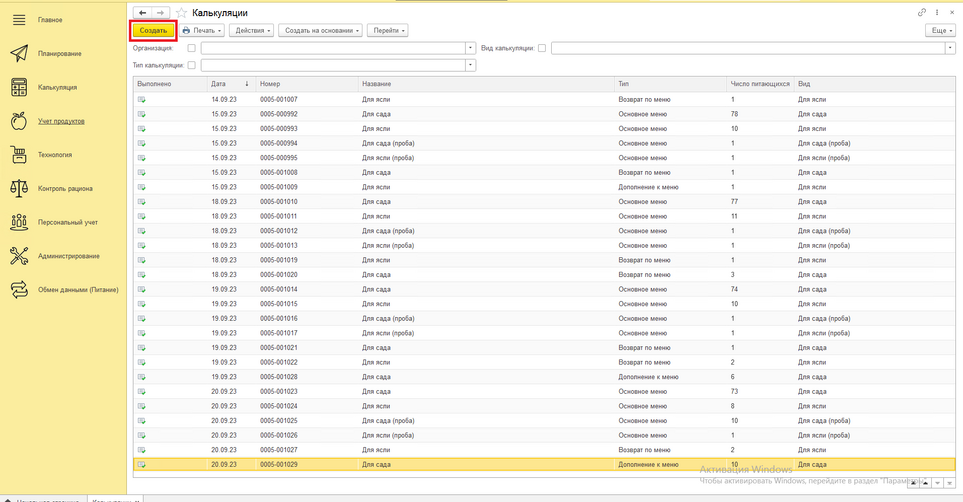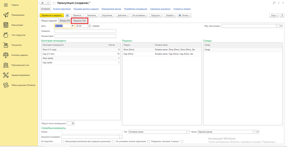 Калькуляция была успешно заполнена. При необходимости меняем блюда и/или добавляем либо убираем продукты из блюд на вкладке "Блюда". Далее переходим на вкладку «Продукты» и нажимаем "обновить"! Далее нажимаем на кнопку "Округление" и подбиваем продукты под нужное нам количество. Нажимаем обновить и записываем документ на кнопку Записать(выглядит как дискета), либо нажимаем "Провести и закрыть".