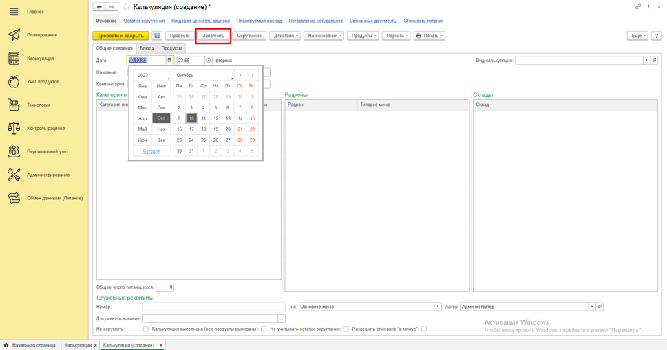 Выбираем дату на которую заполнена заявка на питание и выбираем время 9:00. Выбираем вид калькуляции для того чтобы программа понимала на все категории питающихся мы пишем меню, или раздельно на каждую. Нажимаем «Заполнить».