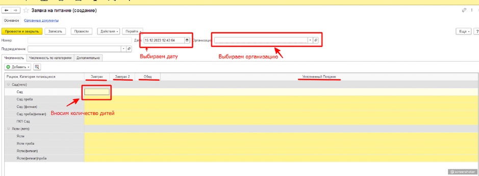 На начальной странице программы 1С:Дошкольное питание нажимаем "Заявка на питание".