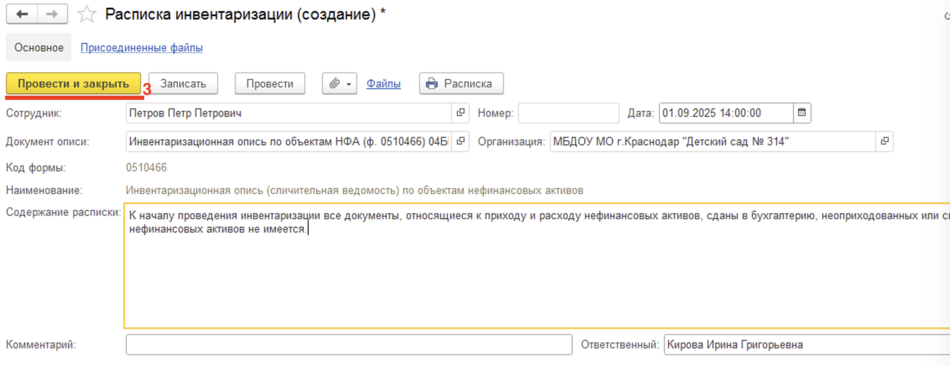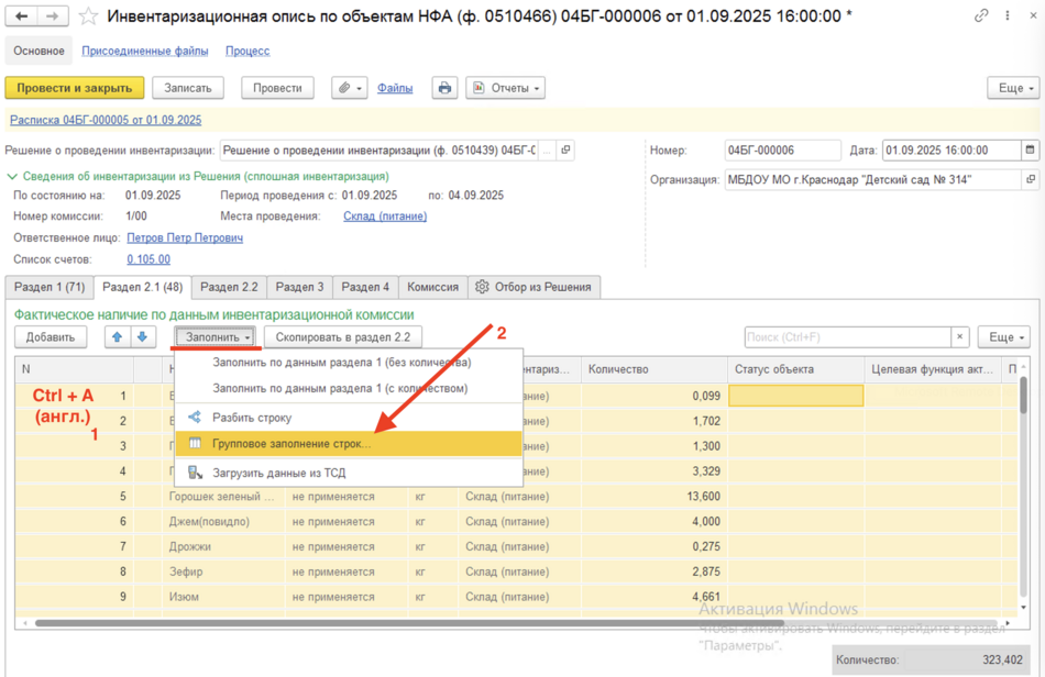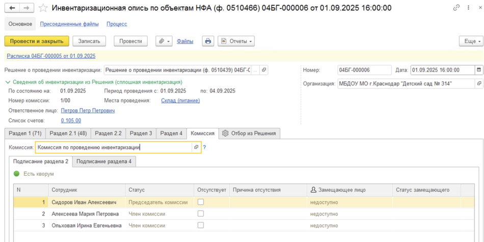 Далее, при переходе на закладку документа Раздел 1 можно будет заполнить ее автоматически по данным бух. учета. Для этого следует предварительно заполнить реквизиты Ответственный исполнитель бух. Службы(1) — как правило автор документа, Ответственный исполнитель инв. Комиссии(2), нажать кнопку Заполнить и выбрать команду Заполнить по данным бух. Учета(3).