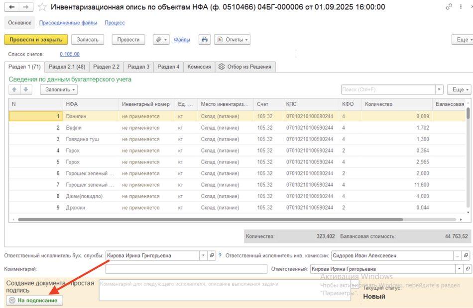 Заполнение расписки ответственным лицом (ответственным лицом группы лиц) является обязательным условием для продолжения заполнения описи, поэтому только после проведения документа Расписка инвентаризации становится возможным заполнение закладок Раздел 1, Раздел 2.1, Раздел 2.2, Раздел 3 и Раздел 4  документа Инвентаризационная опись по объектам НФА (ф. 0510466).