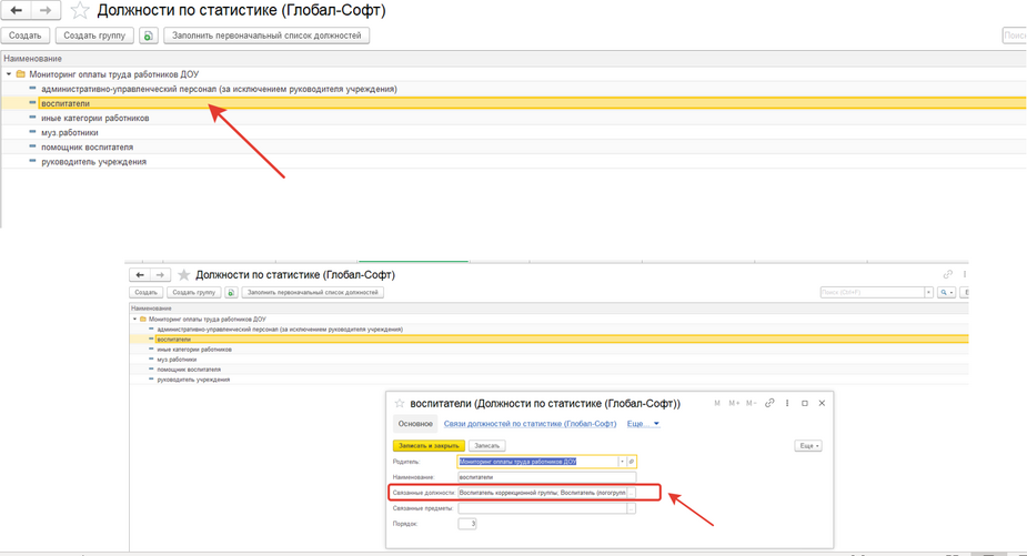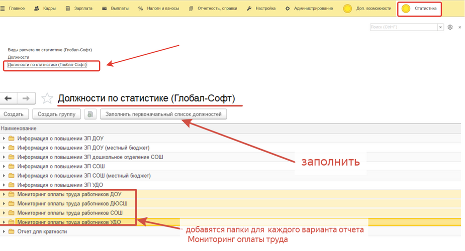 2. В разделе "Статистика" появился справочник "Должности по статистике". В нем есть кнопка "Заполнить первоначальный список должностей", которая заполнит списки для 3 готовых вариантов отчета. Структура справочника будет повторять структуру отчета.