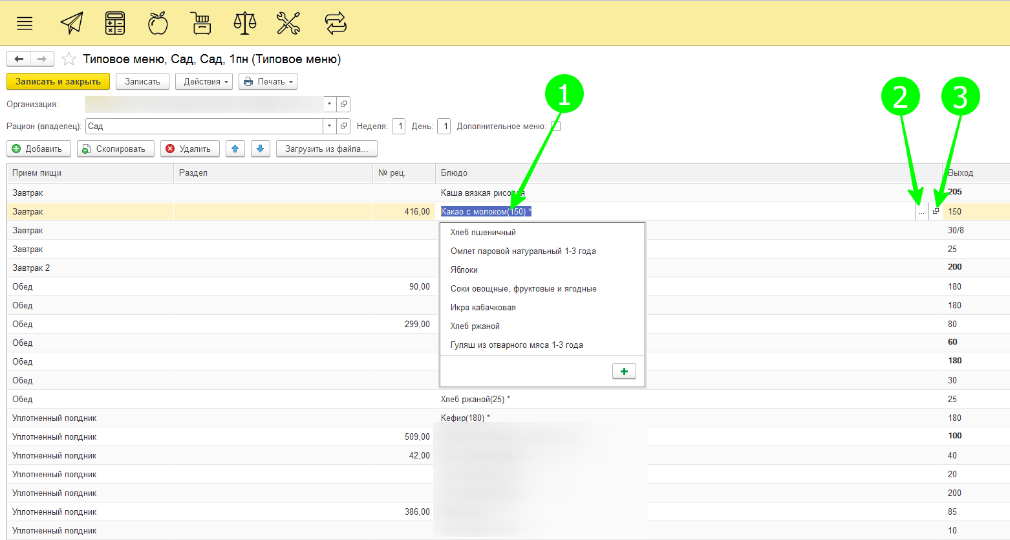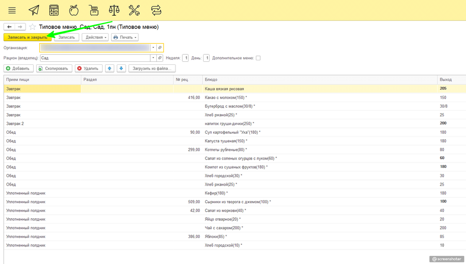 Закончив работу с блюдами, отредактировав нужный день, нажимаем «Записать и закрыть».