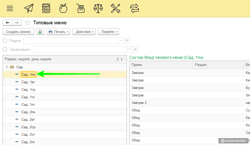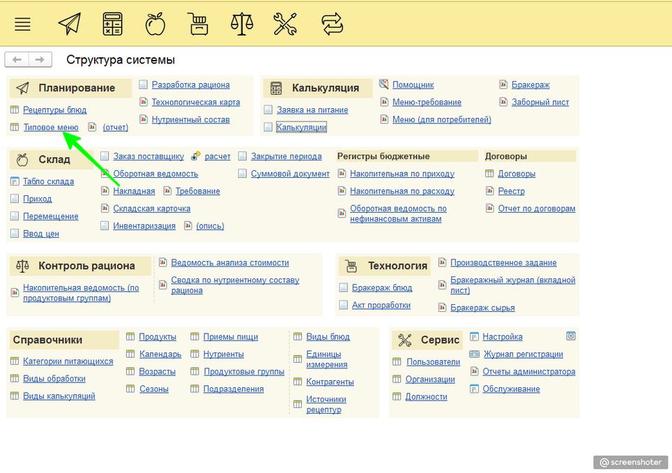 На начальной странице в программе 1С:Дошкольное питание нажимаем на «Типовое меню»