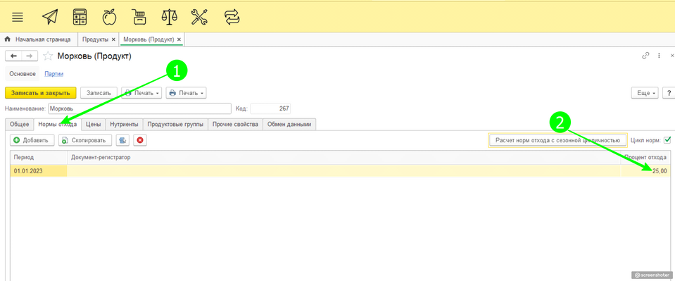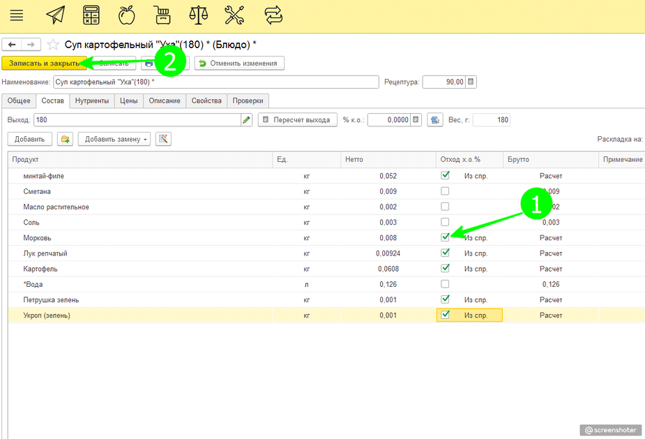 Выполняем "действие №3", зайдя в блюдо через два квадрата. Проставляем галочку расчета процента холодной обработки из справочника по всем используемым блюдам у продуктов, имеющих процент отхода. И нажимаем «Записать и закрыть»