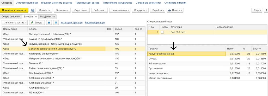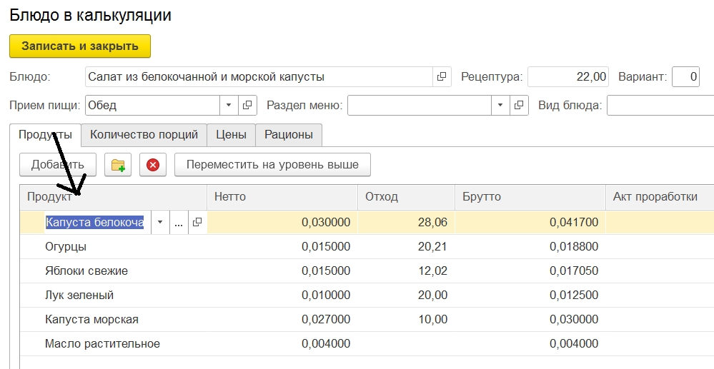 Редактирование происходит в правой части документа калькуляция на вкладке «Блюда». Можно корректировать состав, вес, % отхода и выход блюда. Данные корректировки происходят внутри документа (то есть разово) и на карточку блюда не отражаются. Одним щелчком мыши выделяем блюдо которое будем редактировать и видим в правой табличной части раскладку этого блюда. Щёлкаем два раза по любому продукту и откроется окно редактирования закладки на день написания меню. Можно добавить, удалить или поменять количество продуктов.