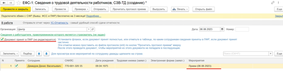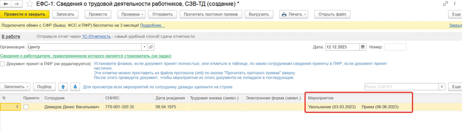 Если в отчет ЕФС-1 (СЗВ-ТД) подтягиваются ненужные мероприятия, например: сотрудник был уволен 03.03.2023 и после принят 09.09.2023, то после его увольнения были переданы сведения в СФР (ПФР) и после его приема необходимо тоже подать сведения, но заполняя отчет программа также указывает мероприятие увольнения от 03.03.2023 (рис.1). Это связано с тем, что, когда подавались сведения об увольнении, не был указан флаг «Документ принят ПФР (не редактируется)» (рис.2). Соответственно, если зайти в отчет сведений по увольнению, отметить этот пункт и снова пере заполнить отчет сведений по приему, то мероприятие с увольнением подтягиваться не будет (рис.3)