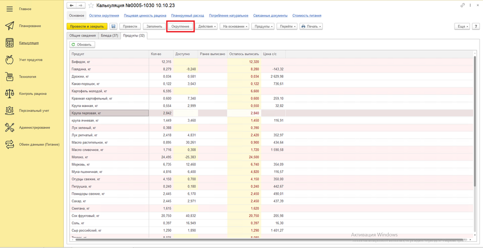 Для того чтобы подбить продукты под нужное нам количество, в документе "калькуляция" переходим в округление продуктов, нажав на одноименную кнопку "Округление".