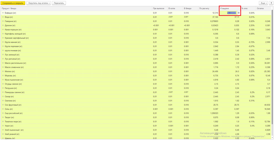 Округляем продукты под нужное нам количество в колонке «К выдаче». После изменения данных нажимаем на кнопку «Записать и закрыть»