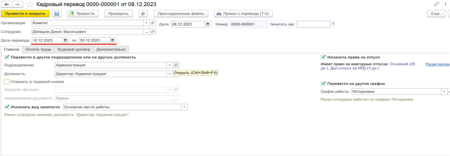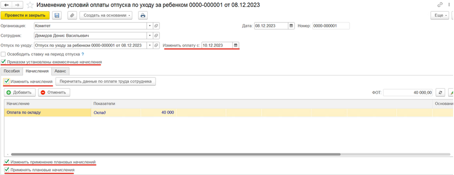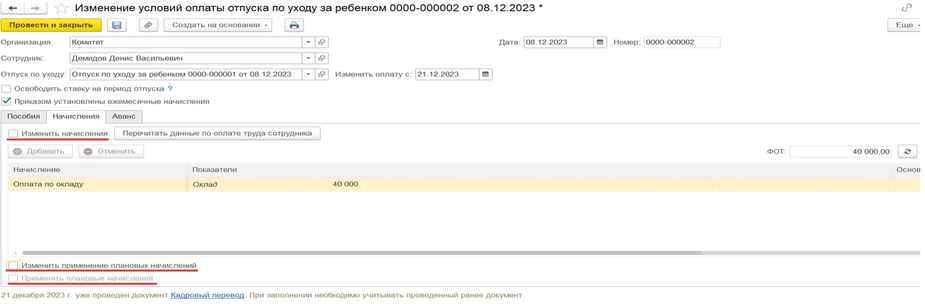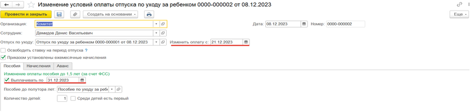Изменение условий оплаты по уходу за ребенком нужно создать и заполнить в том случае, если необходимо изменить условия, т.е. не вводить эти же изменения в документе отпуска по уходу, а именно создать изменение условий оплаты. Например, сотрудник ушел в отпуск с 08.12.2023 и вдруг ему нужно выйти на работу с 10.12.2023 по 20.12.2023, на неполный рабочий день или на полные дни – необходимо: создать документ «Изменение условий оплаты по уходу за ребенком» → где дату «Изменить оплату» указывается та, с которой сотрудник выходит на неполный рабочий день или на полный рабочий день, но на определенный период (ВАЖНОЕ УТОЧНЕНИЕ!!! Если сотрудник выходит на полный рабочий день, галочку с «Выплачивать пособие по» надо убрать (рис.3), т.к. по закону, если сотрудник выходит на полный рабочий день, то пособие выплачиваться не может, если выходит на неполный рабочий день, то флажок нужно оставить) → на вкладке «Начисления» устанавливаем необходимые флажки для применения начислений сотруднику (рис.4) → далее создается документ «Кадровый перевод», который заполняется всеми необходимыми данными на период выхода сотрудника на полный или неполный рабочий день, ВАЖНО УКАЗАТЬ!!! период нахождения сотрудника на работе (рис.5) → после окончания данного периода (в нашем примере это с 10.12.2023 по 20.12.2023) необходимо создать новый документ «Изменение условий оплаты отпуска по уходу» указав дату «Изменить оплату с» следующую дату после окончания периода выхода на работу (в нашем примере это будет 21.12.2023) (рис.6) → установить флажок «Выплачивать по», как это было в первоначальном документе (рис.6), ВАЖНО ПОМНИТЬ!!! Это стоит делать, если сотрудник выходил на полный рабочий день, если нет, то флажок должен быть установлен автоматически → во вкладке «Начисления» убираем все раннее установленные флажки (рис.7) → благодаря таким действиям будет логичное отражение выхода сотрудника на работу на определенный период (на полный или неполный день) и в табеле учета рабочего времени будет правильное отражение учета рабочего времени сотрудника (рис.8)