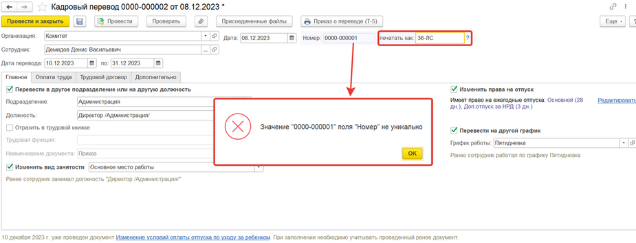 Ошибка «Значение «…» поля «Номер» не уникально»
