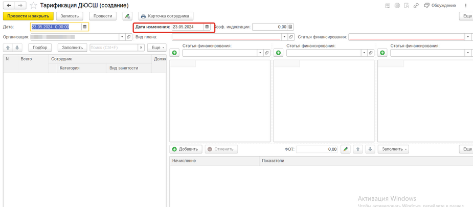 Перетарификация ДЮСШ производится созданием нового документа "Тарификация ДЮСШ" в разделе "Тарификация" → "Тарификация ДЮСШ" → "Создать". ВАЖНО ПОНИМАТЬ, что перетарификация (изменения) не могут быть на один и тот же день, т.е. если тарификация создана 01.01.2024 года, то ее следующее изменение может быть не ранее 02.01.2024 года (именно эта дата устанавливается в поле "Дата изменения") (рис.1)