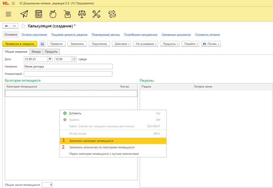 2) Правой кнопкой мыши нажимаем на пустом поле «категории питающихся» и в открывшемся контекстном меню нажимаем «Заполнить количество по категориям питающихся».
