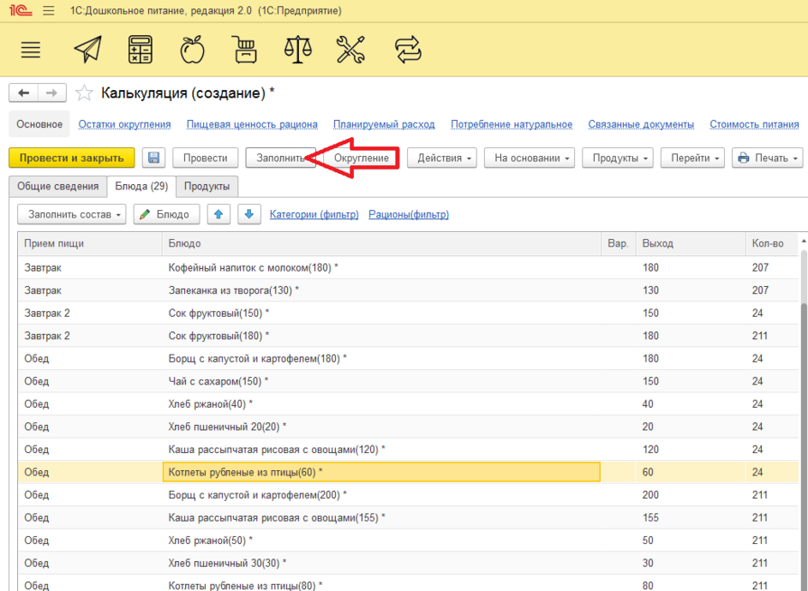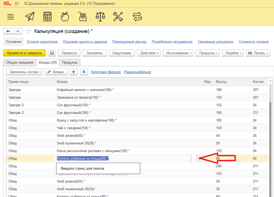 3. Перейдём на вкладку "Блюда" чтобы заполнить блюда(из типового меню) и количество питающихся: