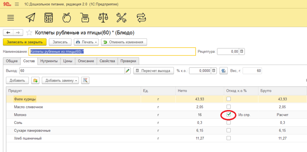 6. Когда нашли блюдо, при заполнении которого высветилась ошибка, двойным щелчком мыши выделяем блюдо и по «двум квадратам» переходим в карточку блюда.