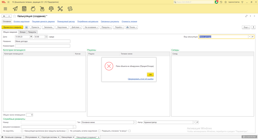 Таким образом по порядку заполняем по порядку все блюда, повторяя 4 и 5 пункты, пока не увидим ошибку «Поле объекта не найдено (ПроцентОтхода)».