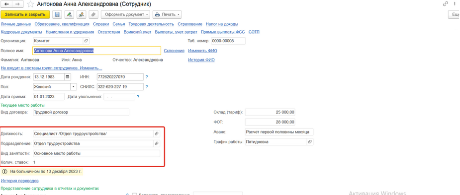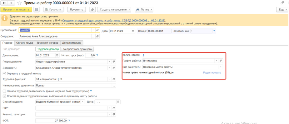 ВАЖНО!!! Для приема на работу сотрудника по внутреннему совместительству, т.е. сотрудника, который уже работает в Вашем учреждении с видом занятости «Основное место работы», первоочередное необходимо создать нового сотрудника на УЖЕ ИМЕЮЩЕЕСЯ в базе физическое лицо, которое работает по основному месту работы и принять его на работу с видом занятости «Внутреннее совместительство». Вид занятости можно узнать в карточке сотрудника (рис.1), в справочнике «Сотрудники» (рис.2) и в документе «Прием на работу» (рис.3)