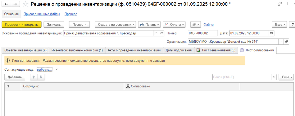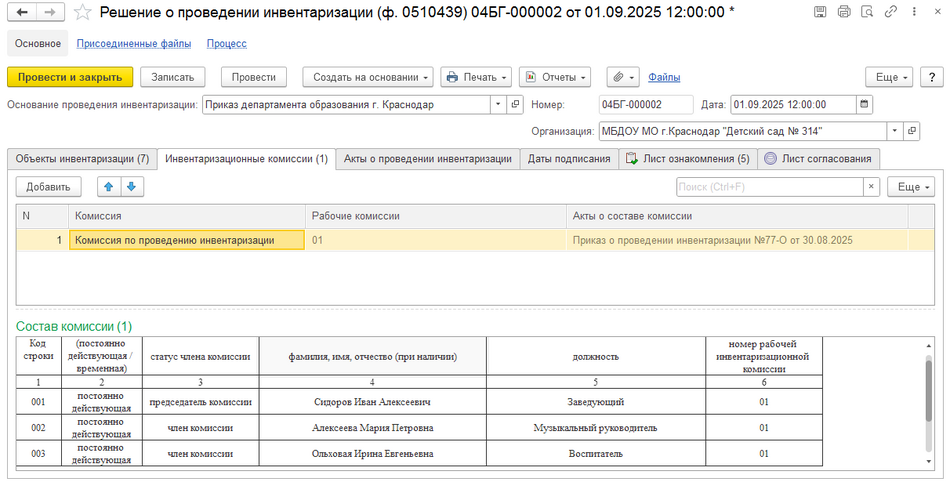 На вкладке Инвентаризационные комиссии необходимо добавить соответствующую комиссию.