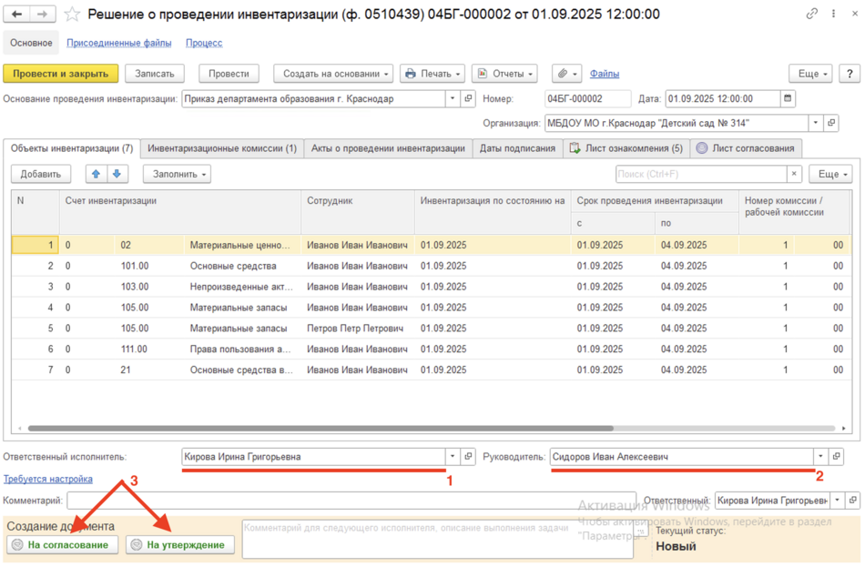 После заполнения вкладок необходимо проверить заполнение полей Ответственный исполнитель(1) и Руководитель(2) и отправить документ(3) На согласование (при наличии согласующих лиц) или На утверждение (при отсутствии согласующих лиц)
