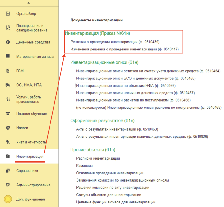Для оформления решения о проведении инвентаризации в учреждении применяются документы раздела Инвентаризация: