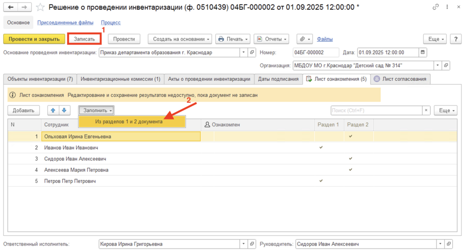 Для заполнения вкладки Лист ознакомления документ нужно предварительно Записать(1), затем по кнопке Заполнить - Из разделов 1 и 2 документа