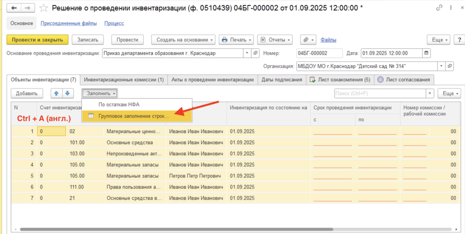 Вкладка Объекты инвентаризации заполнится выбранными ранее остатками. Теперь можно заполнить в ней недостающие реквизиты. Комбинацией клавиш Ctrl + A (англ.) выберем все строки, затем нажмем ЗаполнитьГрупповое заполнение строк.