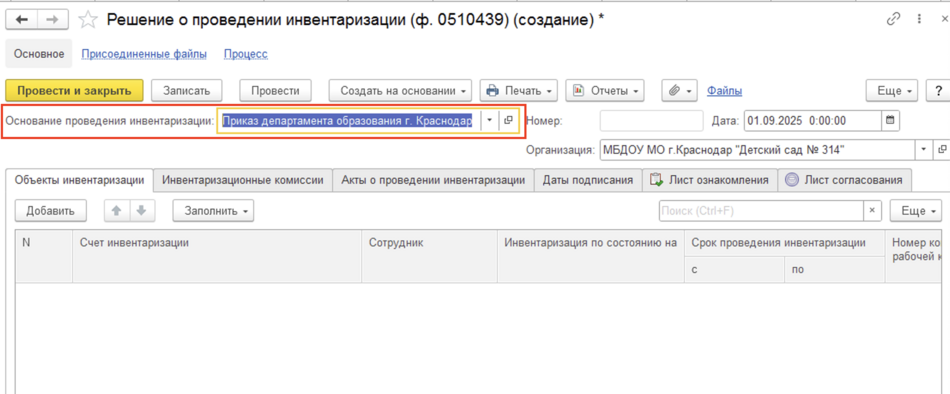 В шапке документа в реквизите Основание проведения инвентаризации можно создать или выбрать из одноименного справочника основание (случай, цель) проведения инвентаризации, предусмотренное законодательством.