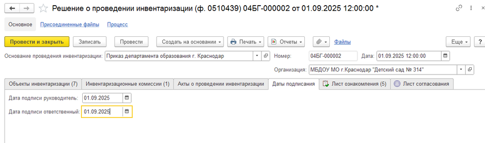 Данный реквизит будет отражен в шапке печатной формы Решения о проведении инвентаризации (ф. 0510439).