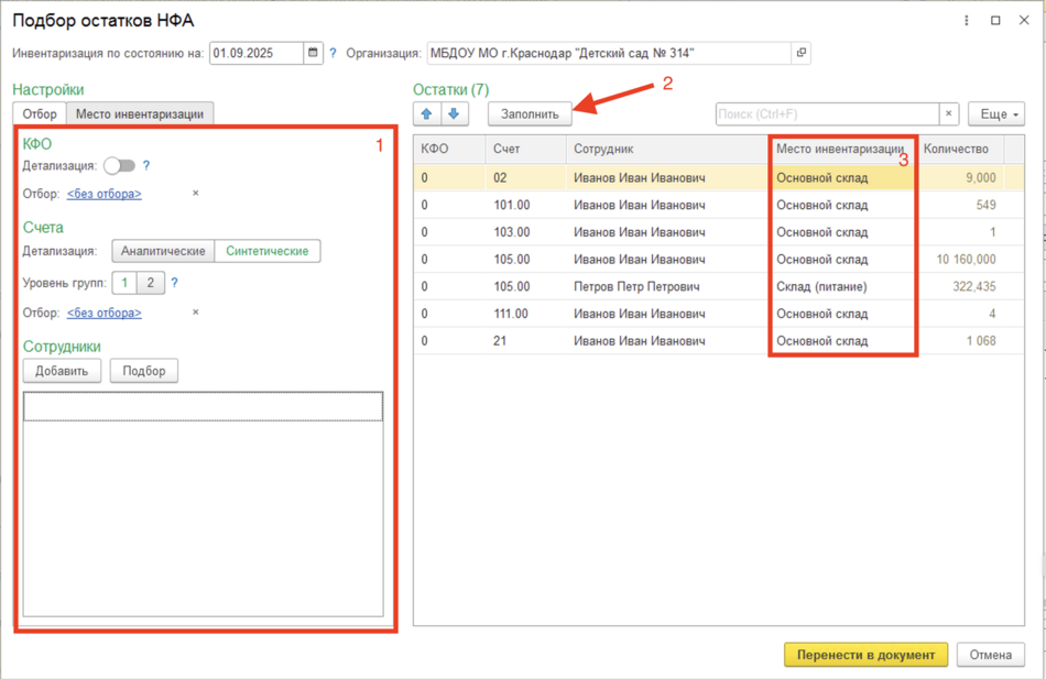 При нажатии на кнопку Заполнить — По остаткам НФА откроется форма Подбор остатков НФА, в которой при необходимости можно выставить необходимые отборы и детализации, выбрать сотрудников (1). Далее по кнопке Заполнить(2) правая часть формы заполнится остатками по заданным отборам.
