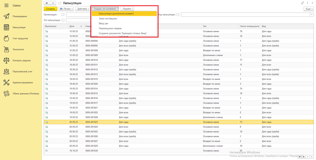 Для создания дополнения или возврата нужно выбрать основное меню, к которому создается документ(допа\возврата). Одним щелчком мыши выбираем основное меню, нажимаем на кнопку «Создать на основании» и выбираем «Калькуляция (дополнение, возврат)»