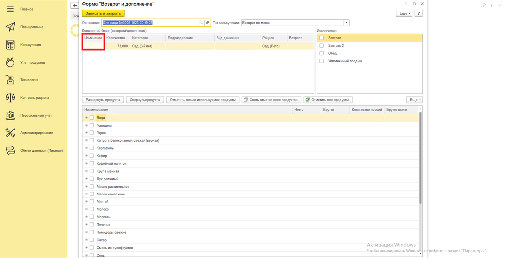В колонку «Изменение» нужно подставить разницу детей, по которому нужно сделать возврат/дополнение. Пример: Основное меню написано на 250 детей, а по факту пришло 255. В колонку изменений ставим цифру 5. В правом верхнем углу, в колонке исключения, проставляем галочки у тех приёмов пищи, по которым мы не будем забирать/выдавать продукты. Нажимаем кнопки по порядку "Отметить только используемые продукты" и "Свернуть продукты". В нижней таблице отмечаем те продукты которые будем забирать или добавлять, в зависимости от типа меню(основное или возвратное). Нажимая на + слева от каждого продукта, можно увидеть в какие блюда данный продукт входит. Если продукт отмечен зелёной галочкой - значит он будет возвращаться или добавляться во все блюда в которых используется, если продукт отмечен серым квадратом - значит не из всех блюд этот продукт будет изыматься или добавляться. В конце нажимаем на кнопку "Записать и закрыть".