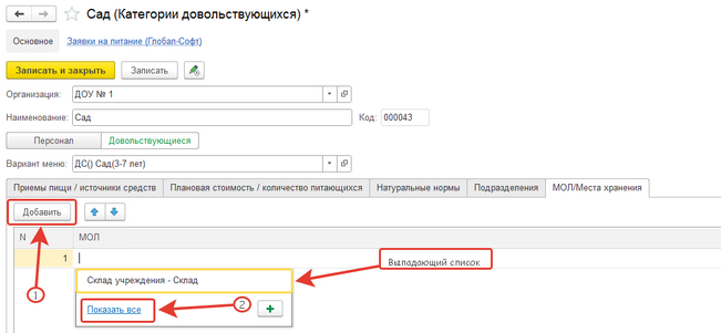 Далее необходимо нажать "Добавить" - "Показать все" и выбрать МОЛа, также можно выбрать из "Выпадающего списка"