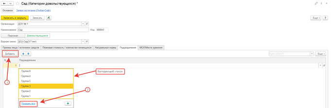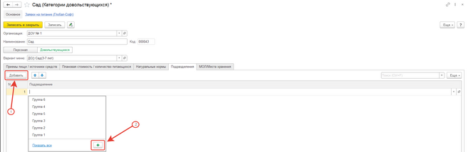 Также если несколько "Категорий довольствующихся" уже созданные группы можно добавлять другим категориям, для этого необходимо нажать "Добавить" и "Показать все", либо выбрать из "Выпадающего списка"