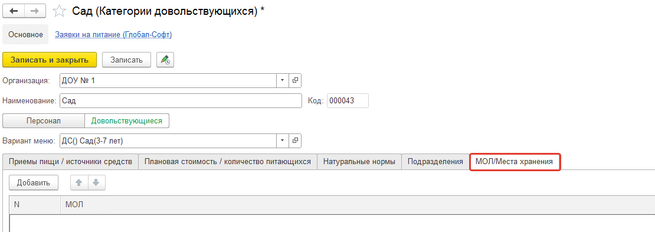 Для того, что привязать "Категорию довольствующихся" к МОЛу необходимо зайти во вкладку "МОЛ/Места хранения"