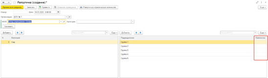 Как только документ заполнится необходимо каждой группе проставить "Количество" детей, которое фактически пришли