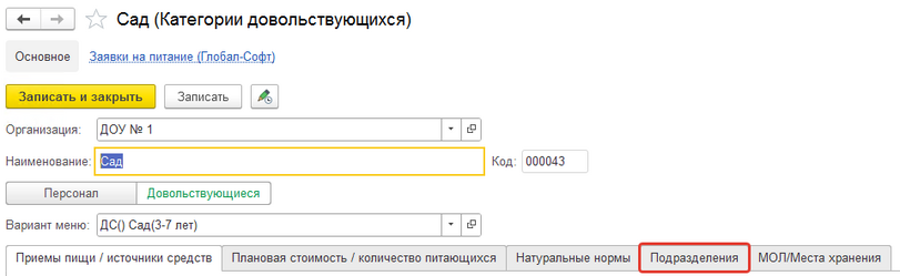 После добавление "Подразделений" и привязка категории к "МОЛу" - необходимо нажать "Записать и закрыть".