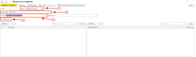 Предварительная настройка завершена, теперь можно перейти к документу "Рапортичка", который находится в "Учет питания" - "Рапортичка"