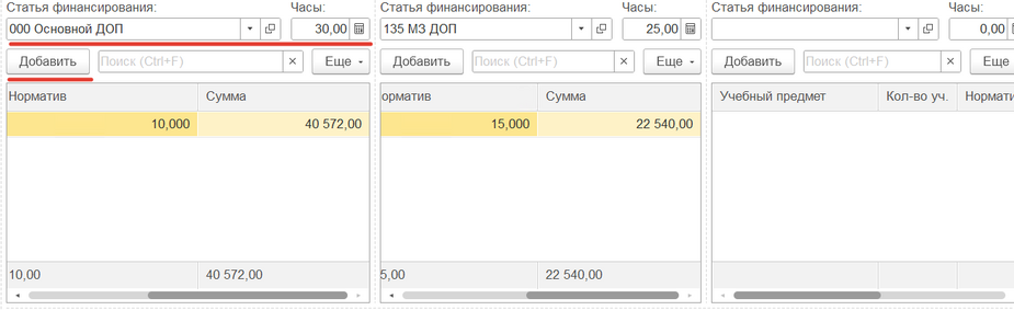 Чтобы заполнить пед. нагрузку на нужного сотрудника необходимо: в табличной части пед. нагрузки указать статью финансирования, установить количество часов и нажать на кнопку "Добавить" (рис.2)