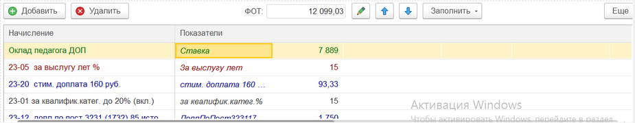 После заполнения табличной части пед. нагрузка необходимо заполнить начисления по сотруднику в табличной части начислений (если этого не было сделано ранее). Сделать это можно так же через кнопку "Добавить" и при необходимости убрать ненужное начисление у сотрудника нажать на кнопку "Отменить", начисление поменяет цвет в зависимости от проделанных действий (рис.3):
